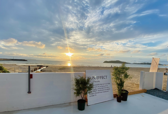 SUN EFFECTは1Fにレストラン&カフェ、2Fにプライベートサウナという構成の複合施設です。福間海岸の目の前という絶好のロケーションのもと、「訪れる人々の心身を整え、前向きな毎日をセットする」というミッションを掲げています。